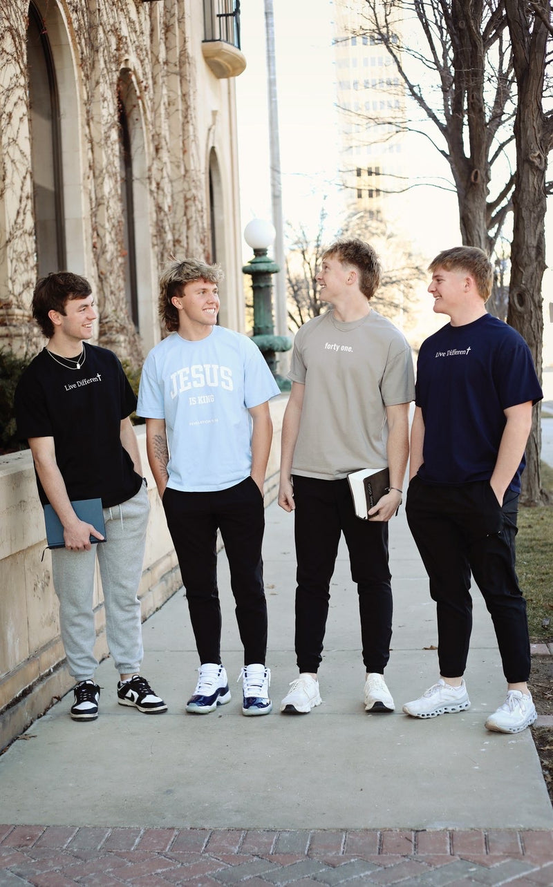 41 began with two friends—Boston in Amarillo and Gavin in Conway—turning late-night bedroom ideas into a shared vision. What started small grew into a clean, minimalist Christian clothing brand. At its heart, 41 is still about creating meaningful, high-quality pieces rooted in faith.